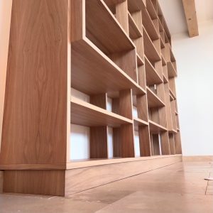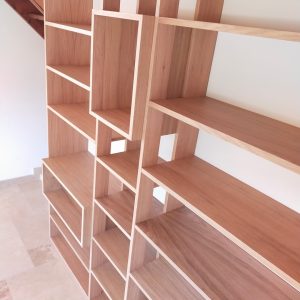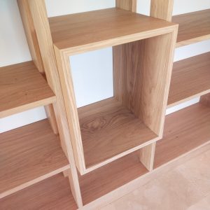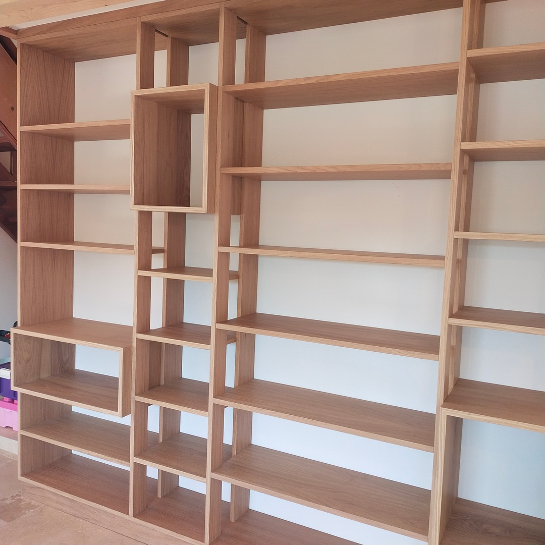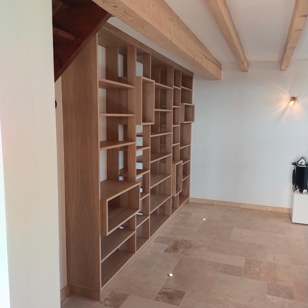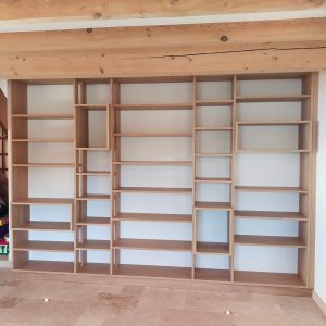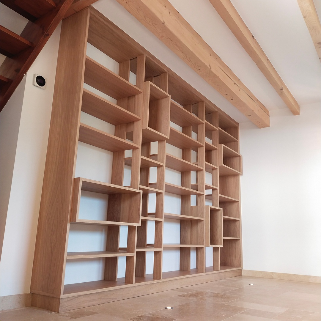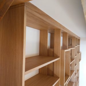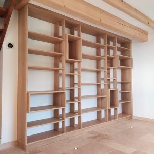 Cette bibliothèque a été réalisée en latté chêne, avec une finition huilée.