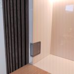 Les panneaux muraux sont de la marque WoodUpp, finition « chêne gris rustic » et permettent de fixer un support d’écran.