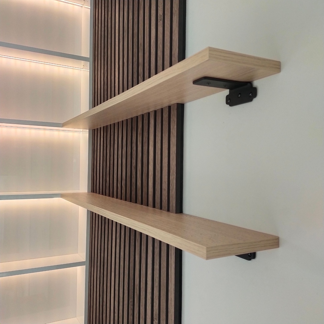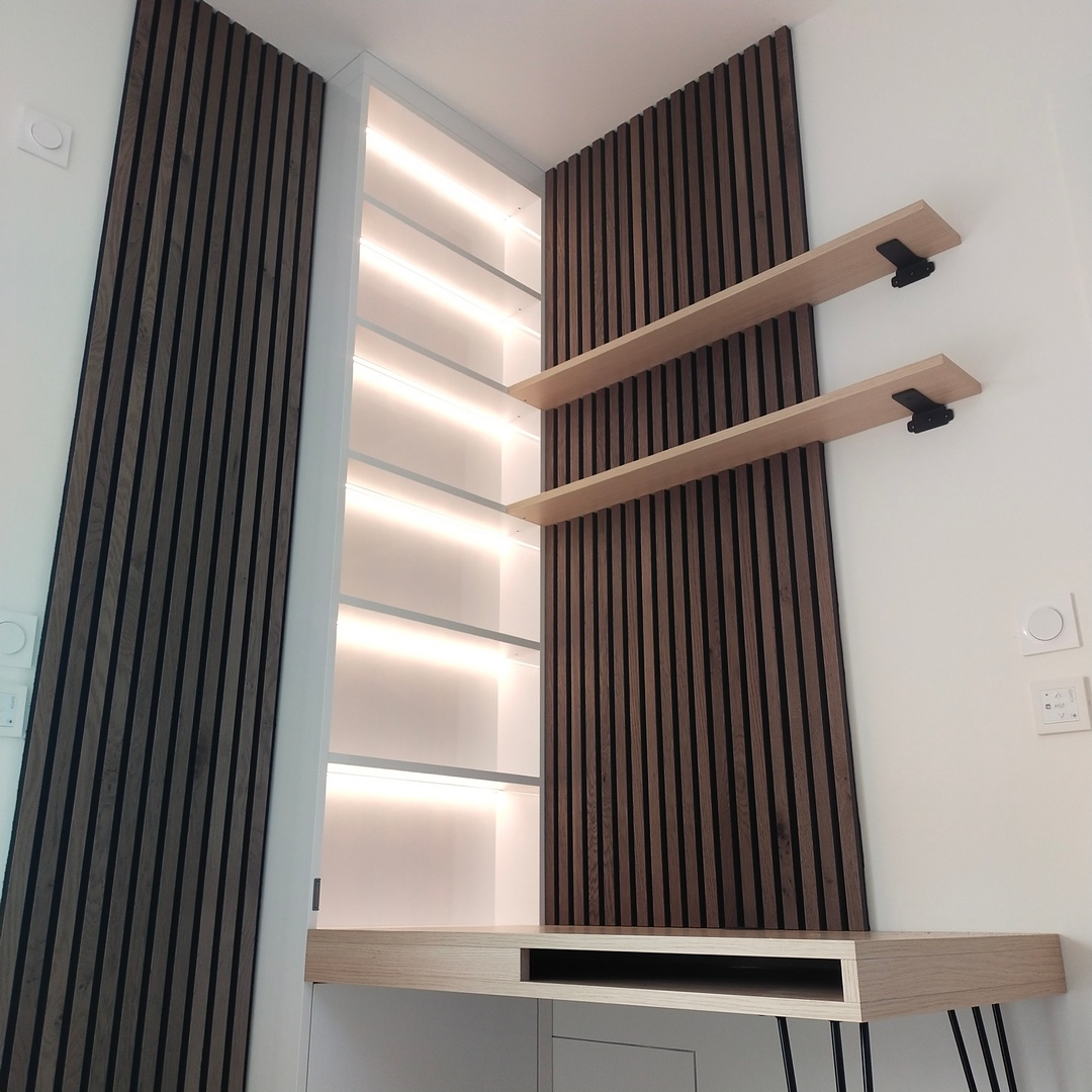 Les panneaux muraux sont de la marque WoodUpp, finition « chêne gris rustic » et permettent de fixer un support d’écran.