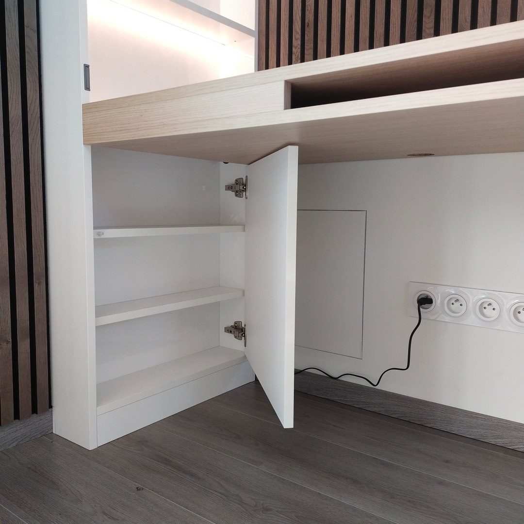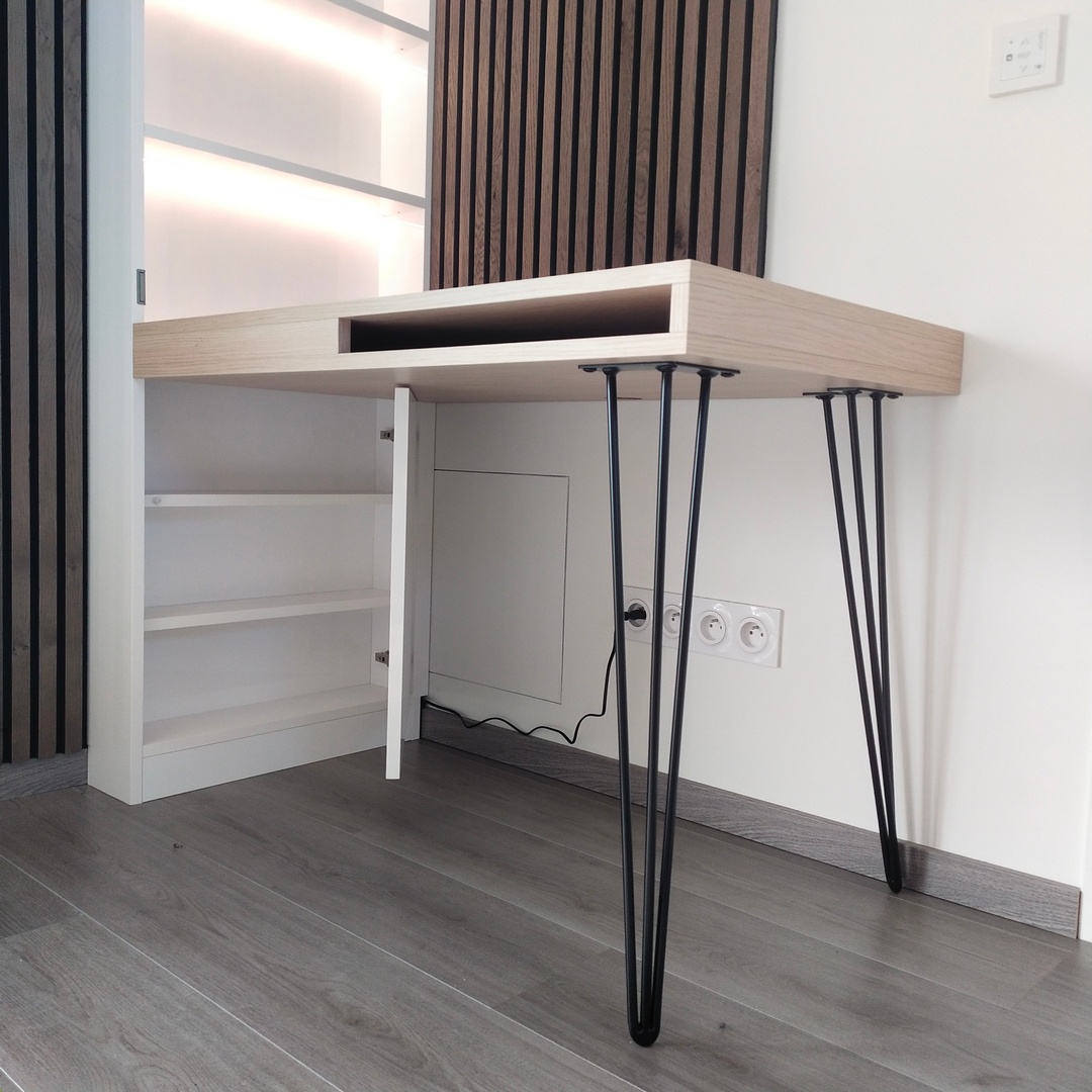 Il est réalisé entièrement en panneaux mélaminés « blanc alpin brillant » et décor « châtaignier sable ». Le bureau est soutenu par des pieds aiguilles en métal laqué noir. La bibliothèque est équipée de profils LED munis d’un variateur d’intensité et de chaleur, commandés par un bouton radio dont le support est incrusté dans un montant mais qui peut être détaché. Les câbles sont dissimulés dans une double cloison.