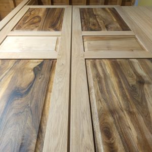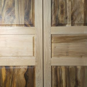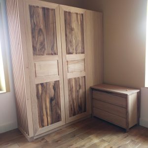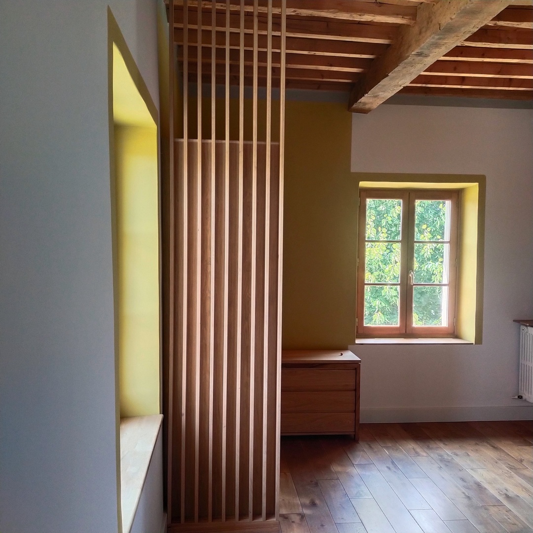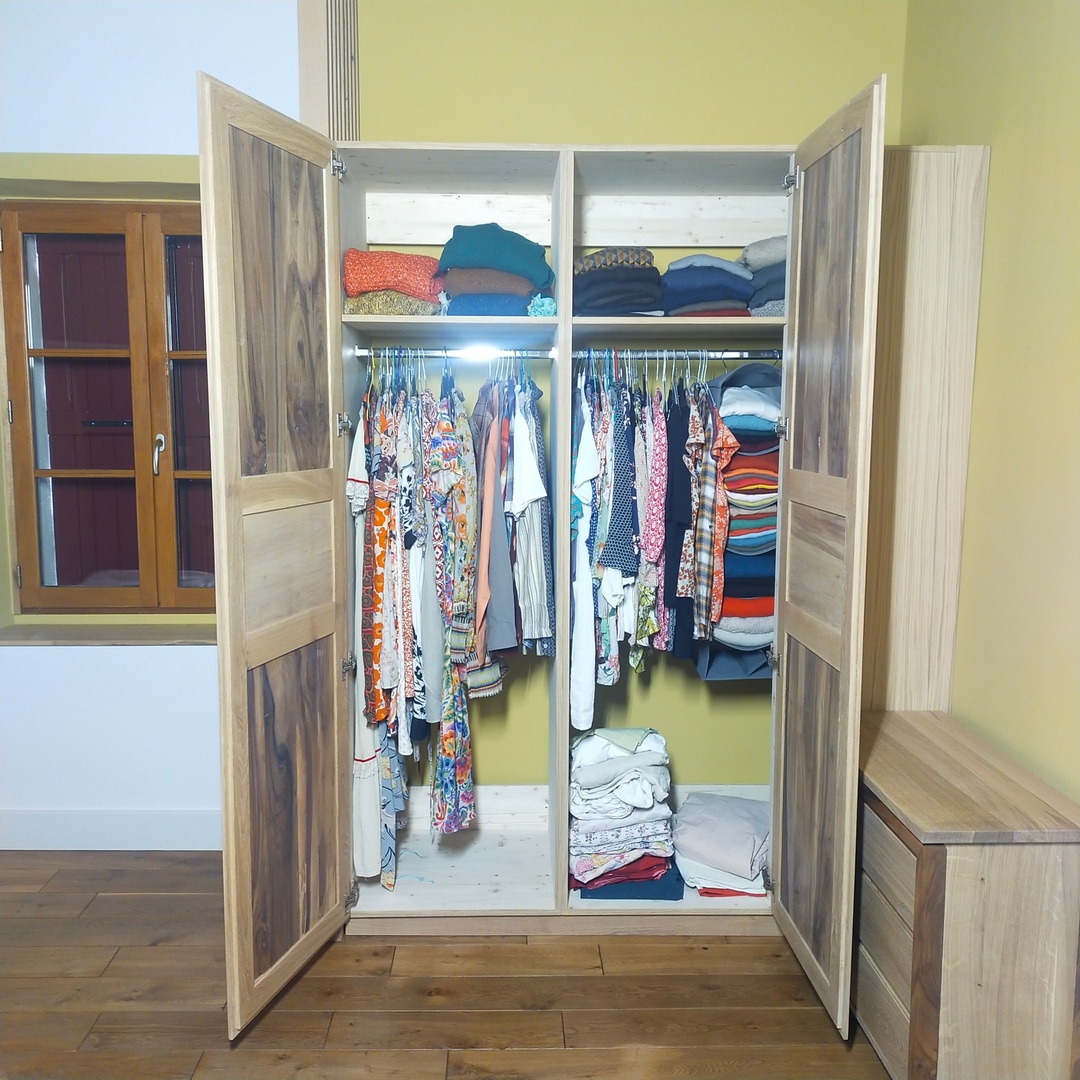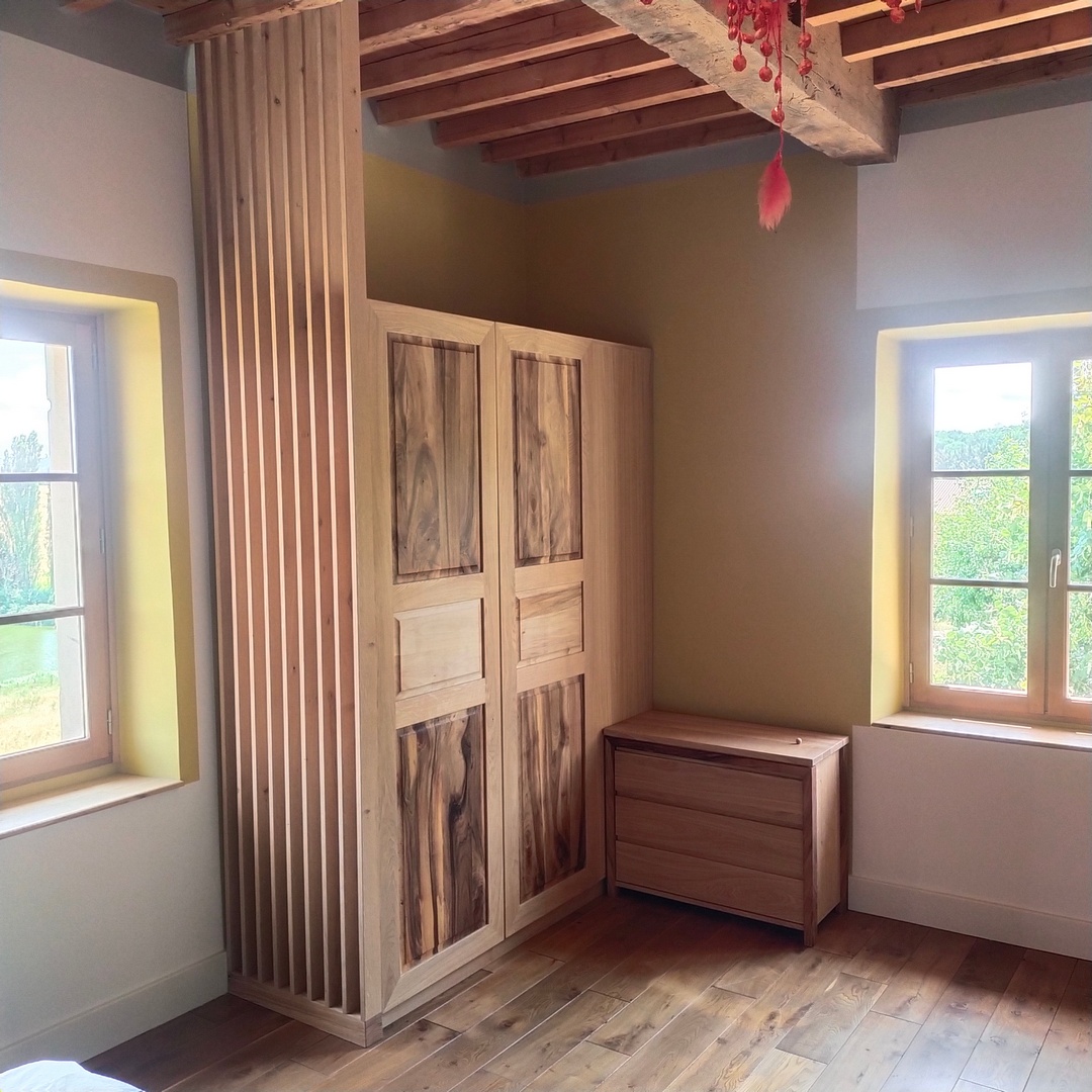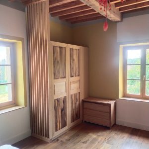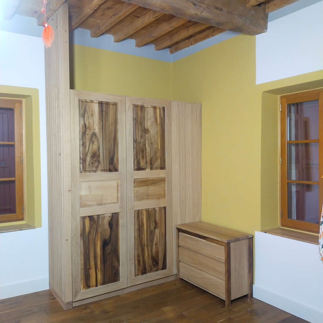 Cet aménagement a été réalisé dans une ancienne cure en pisé datant de 1837. Le choix du chêne et du noyer du Dauphiné est apparu comme une évidence. Seul l’intérieur du dressing est en panneau 3 plis sapin. Le projet comportait une grande armoire dressing, un claustra, une petite commode 3 tiroirs et une autre plus grande équipée d’une petite banquette. Un valet de chambre en merisier a été ajouter pour recevoir les habits du jour.
