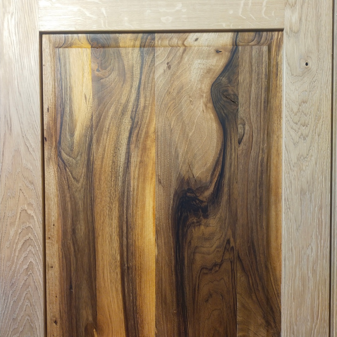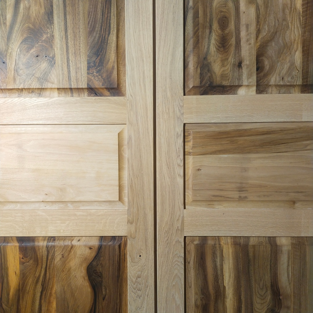 Les panneaux de portes en noyer composent de véritables tableaux et font écho aux cadres des commodes. Tout a été huilé pour garantir l’absence de composés organiques volatils dans la chambre. Les peintures sont écologiques et fabriquées par l’artisan peintre qui a également réalisé l’enduit terre un des murs. N’hésitez pas à le contacter : Anachromie.