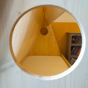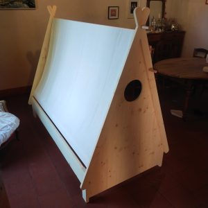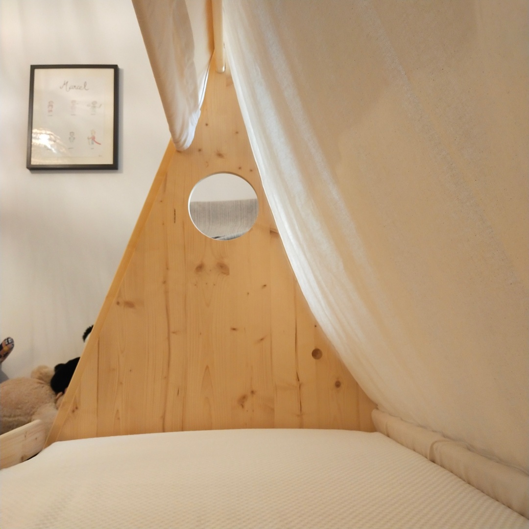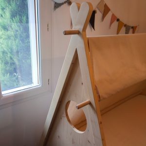 Ce lit cabane en forme de tente canadienne a été réalisé en pin massif. La toile est démontable pour permettre de la passer au lavage.