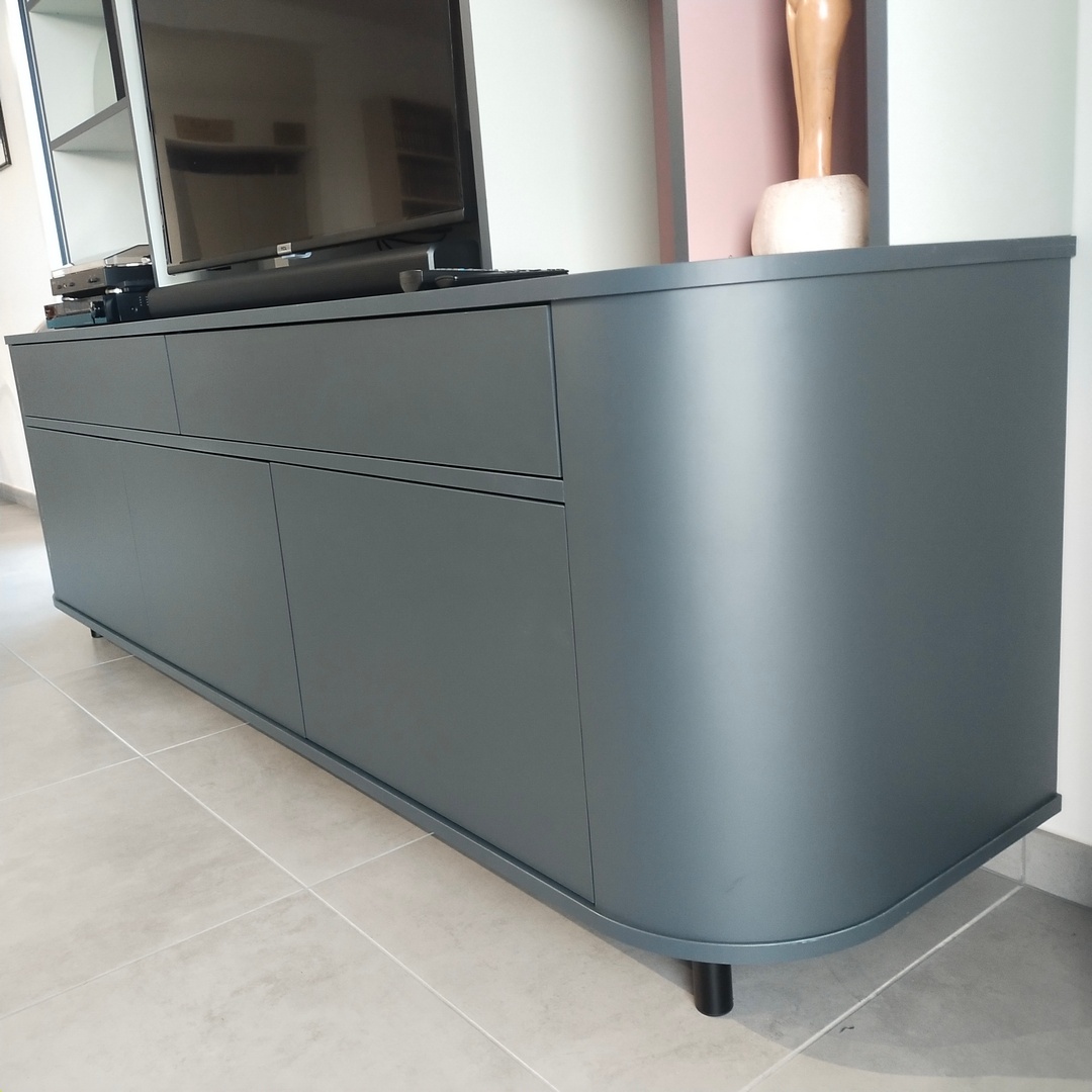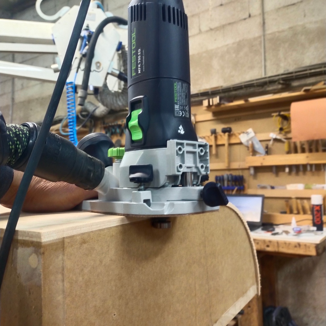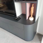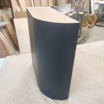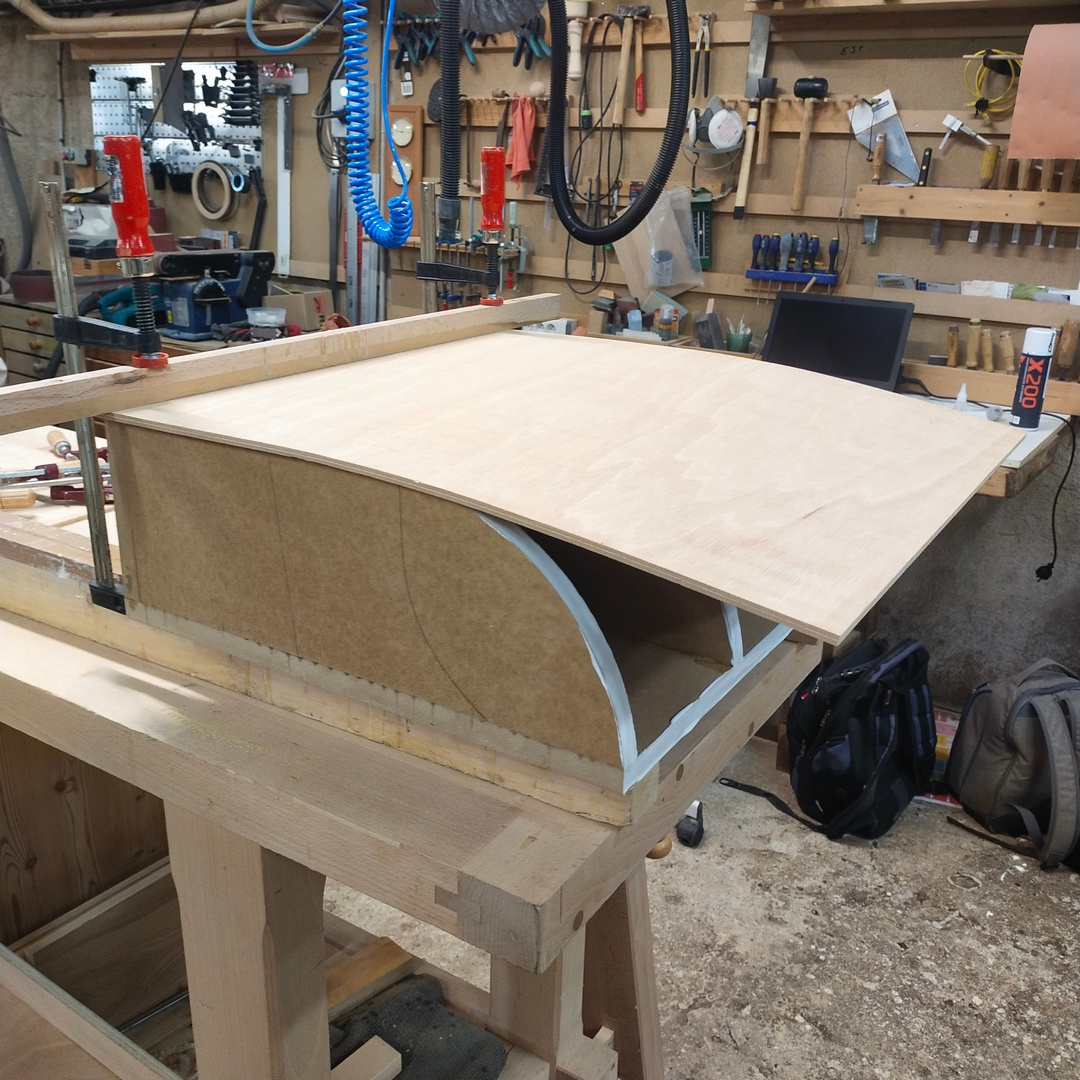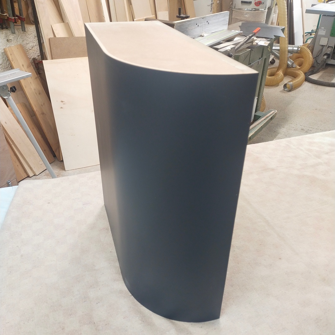 Une étape originale de ce projet fut la fabrication des joues galbées du caisson bas. Il a fallu tout d’abord fabriquer une structure courbe en médium sur laquelle a été collé un contre-plaqué cintrable. Une fois cette structure réalisée, restait à collé à la colle contact les feuilles de stratifié.