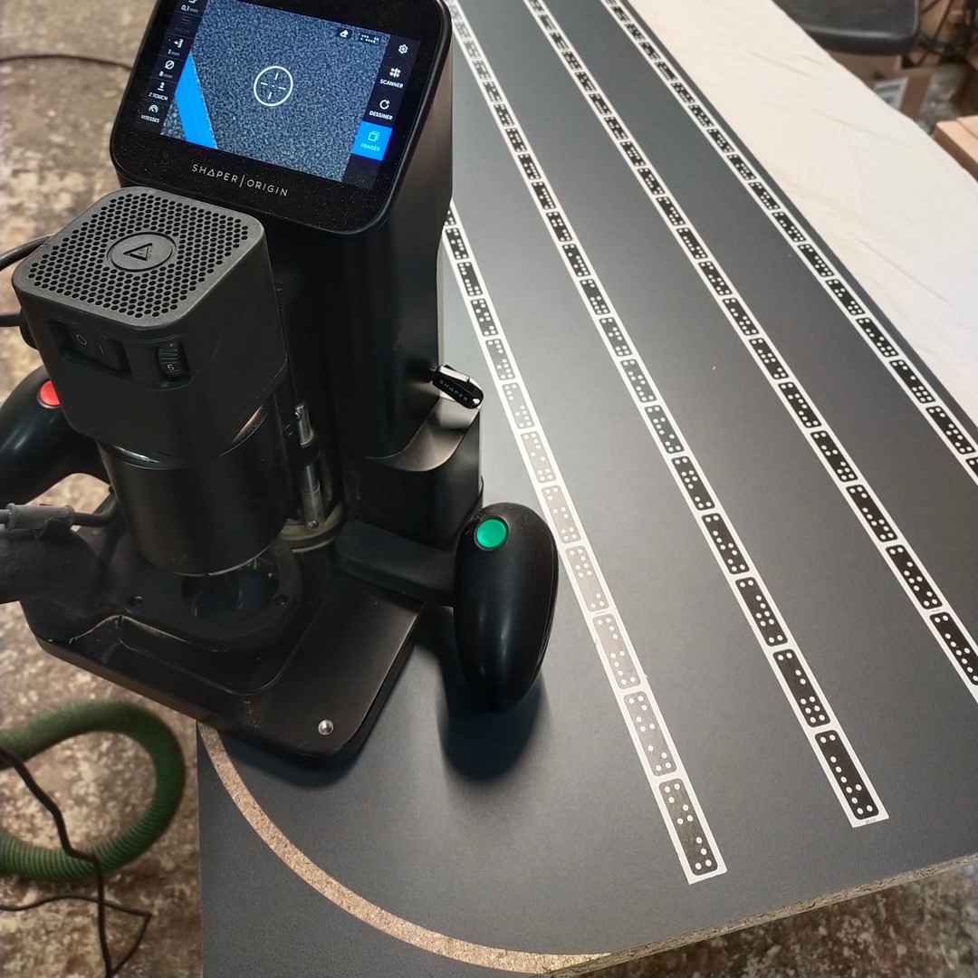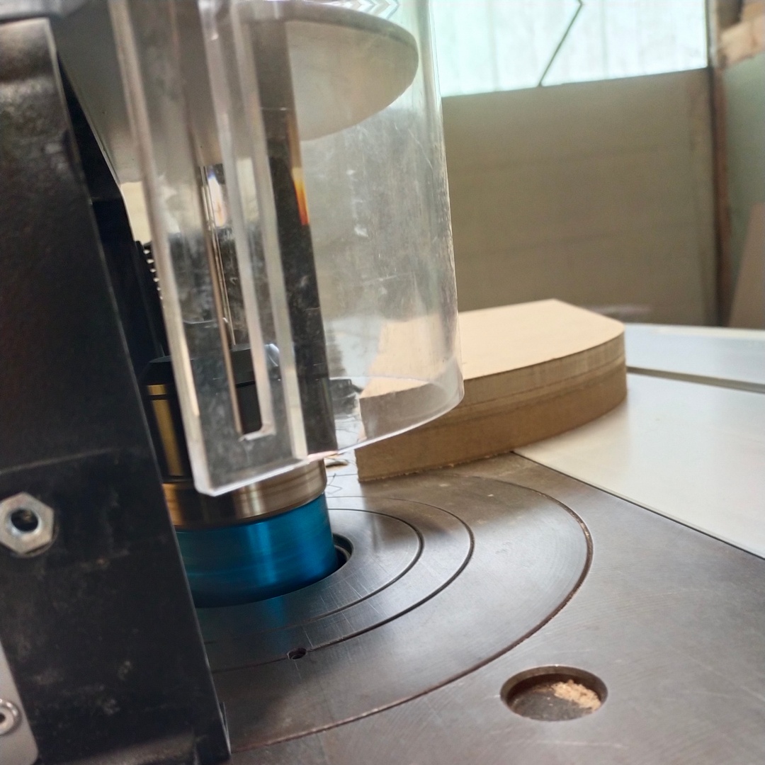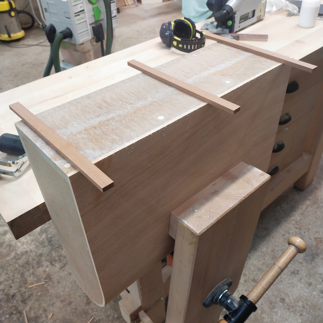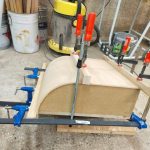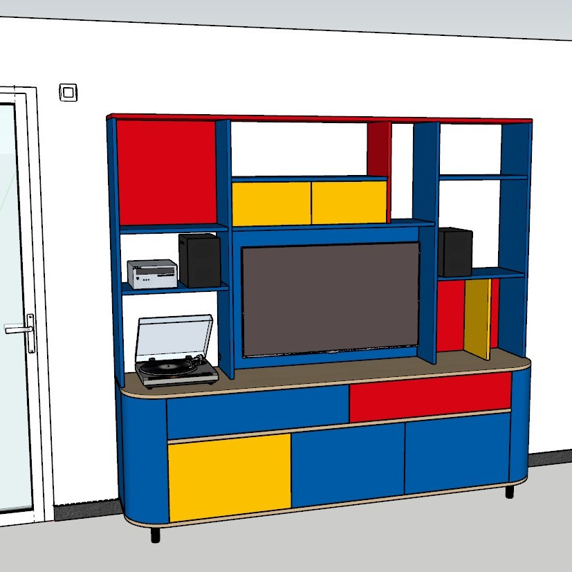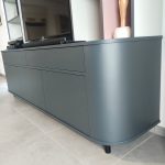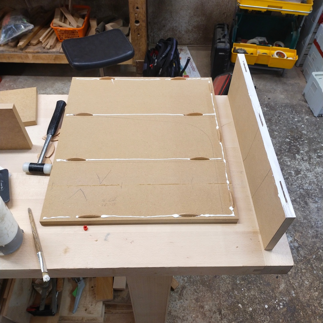 Une étape originale de ce projet fut la fabrication des joues galbées du caisson bas. Il a fallu tout d’abord fabriquer une structure courbe en médium sur laquelle a été collé un contre-plaqué cintrable. Une fois cette structure réalisée, restait à collé à la colle contact les feuilles de stratifié.