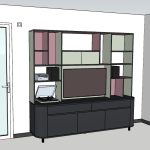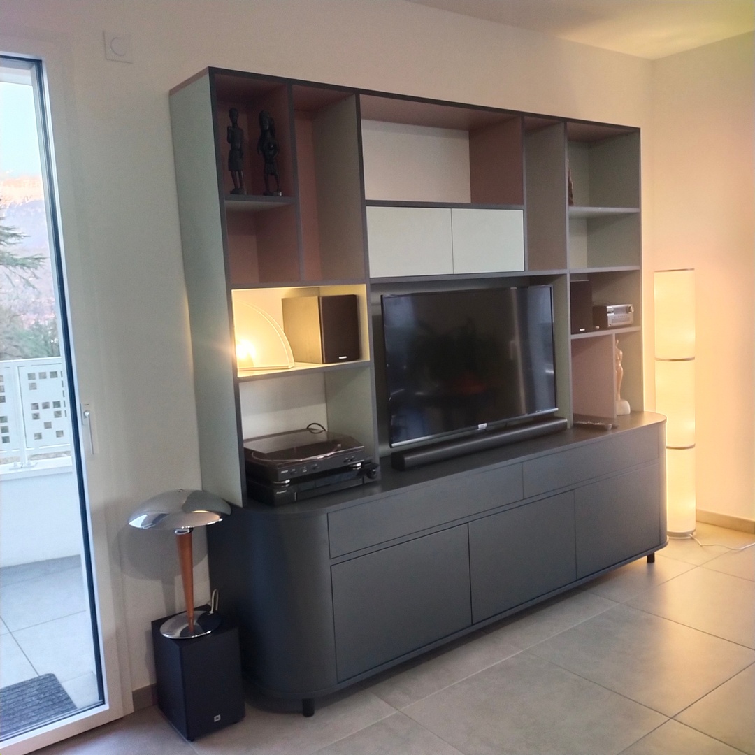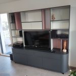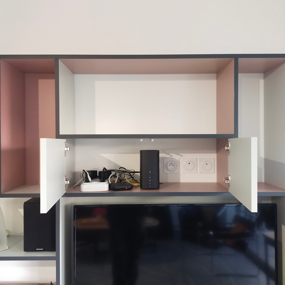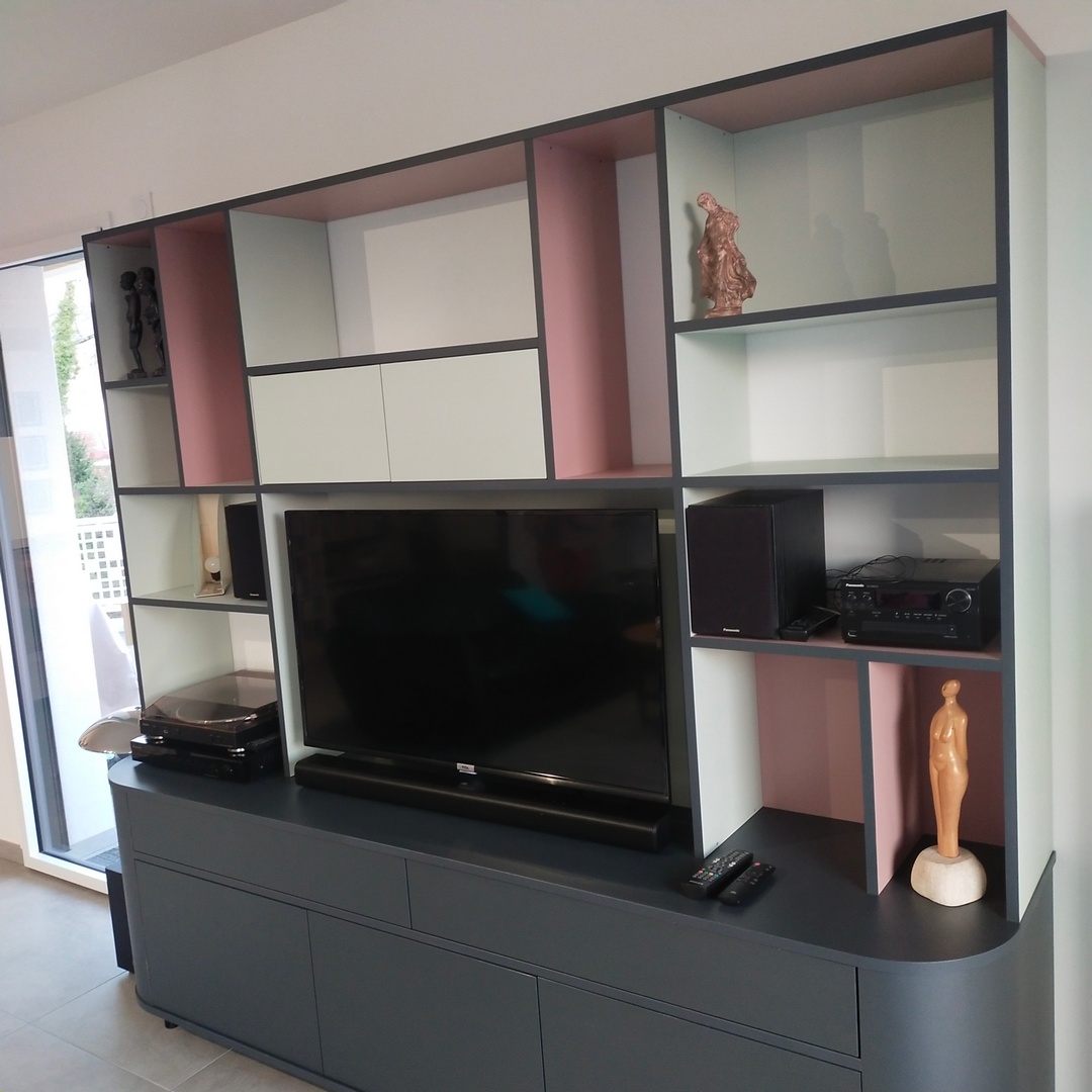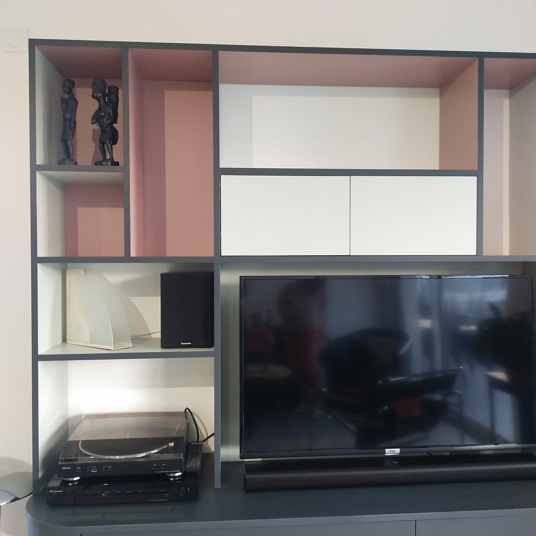 Mes clientes souhaitaient un meubles d’inspiration « Mondrian ». Après de nombreuses versions, le choix s’est finalement arrêté sur des teintes plus douces et une géométrie très contemporaine. La partie basse avec ses joues galbées est équipée de 5 tiroirs « push to open ». La teinte gris graphite est rappelée sur les chants de la partie haute dont les panneaux alternes entre un vert opale et un rose antique.
