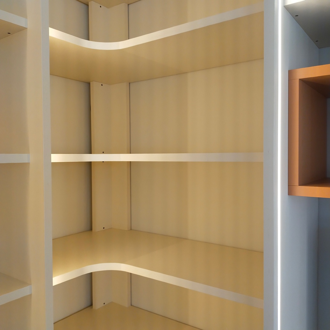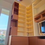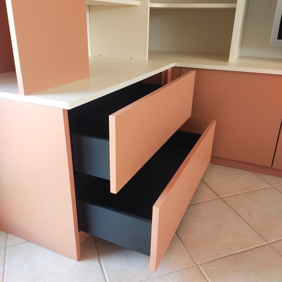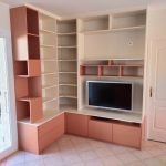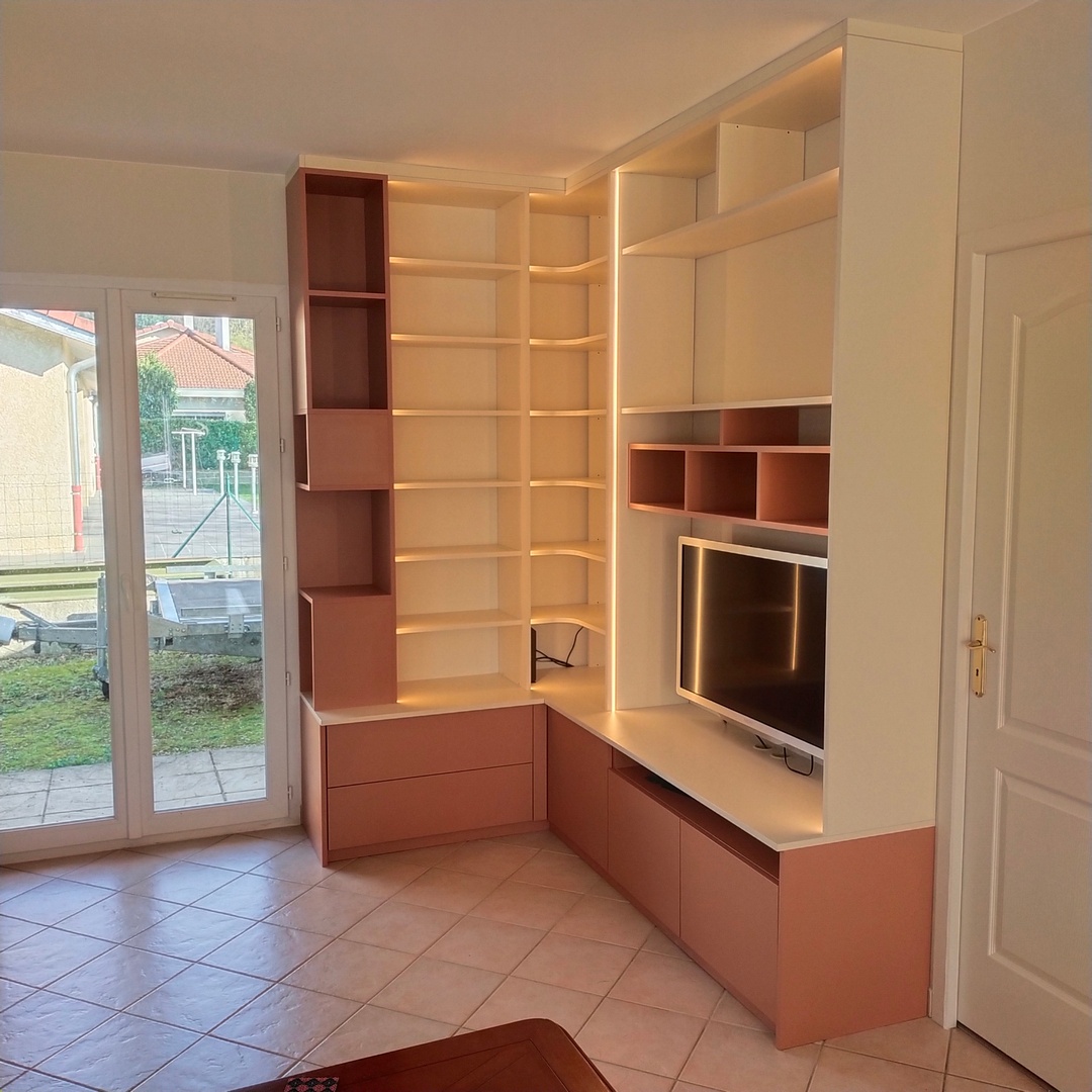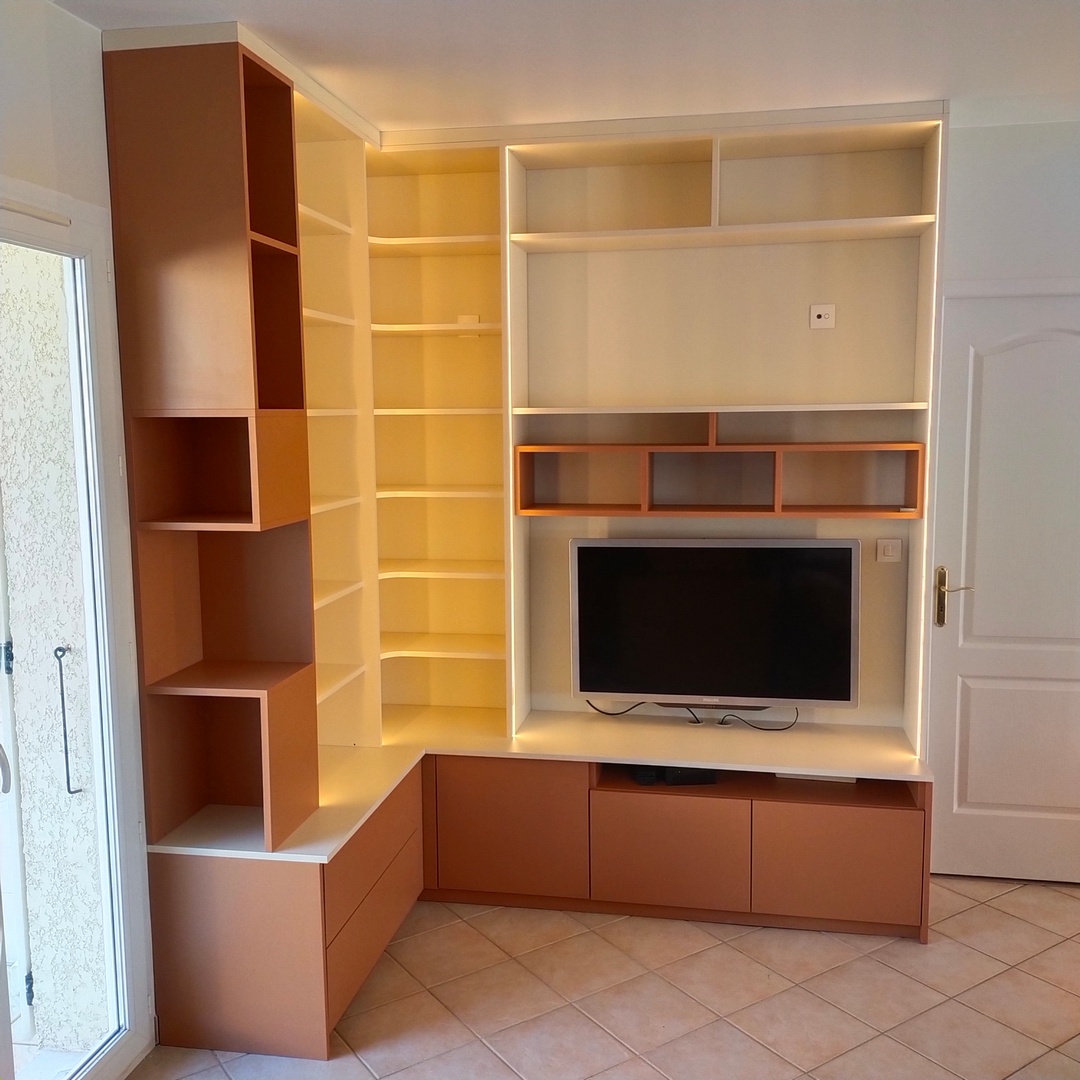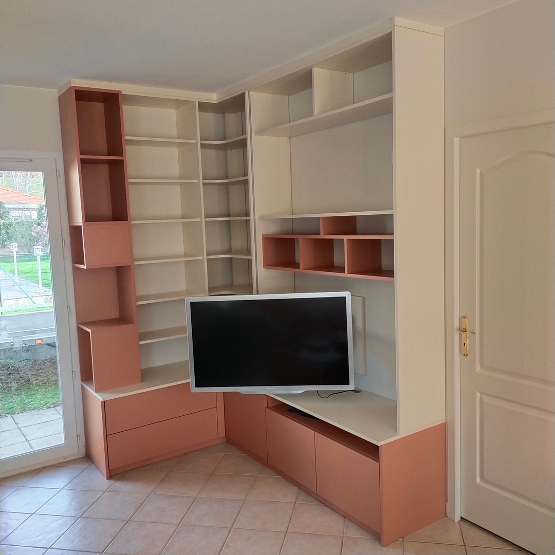 Cet agencement d’angle devait servir à la fois de meuble TV, de bibliothèque et de support pour une collection de statuettes. Les teintes retenues sont le Beige sable associé au Terracotta. Les tiroirs et les portes sont équipés de systèmes d’ouverture « push to open ».