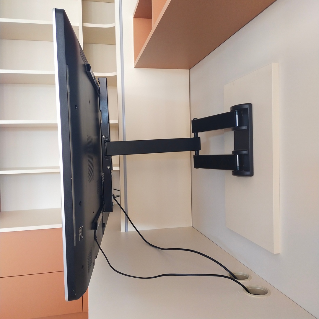 La TV est supportée par un bras articulé fixé sur 2 panneaux prenant la cloison en sandwich. Nous avons réussi à masquer presque tout les câblages (LED, Hifi, vidéo, box).