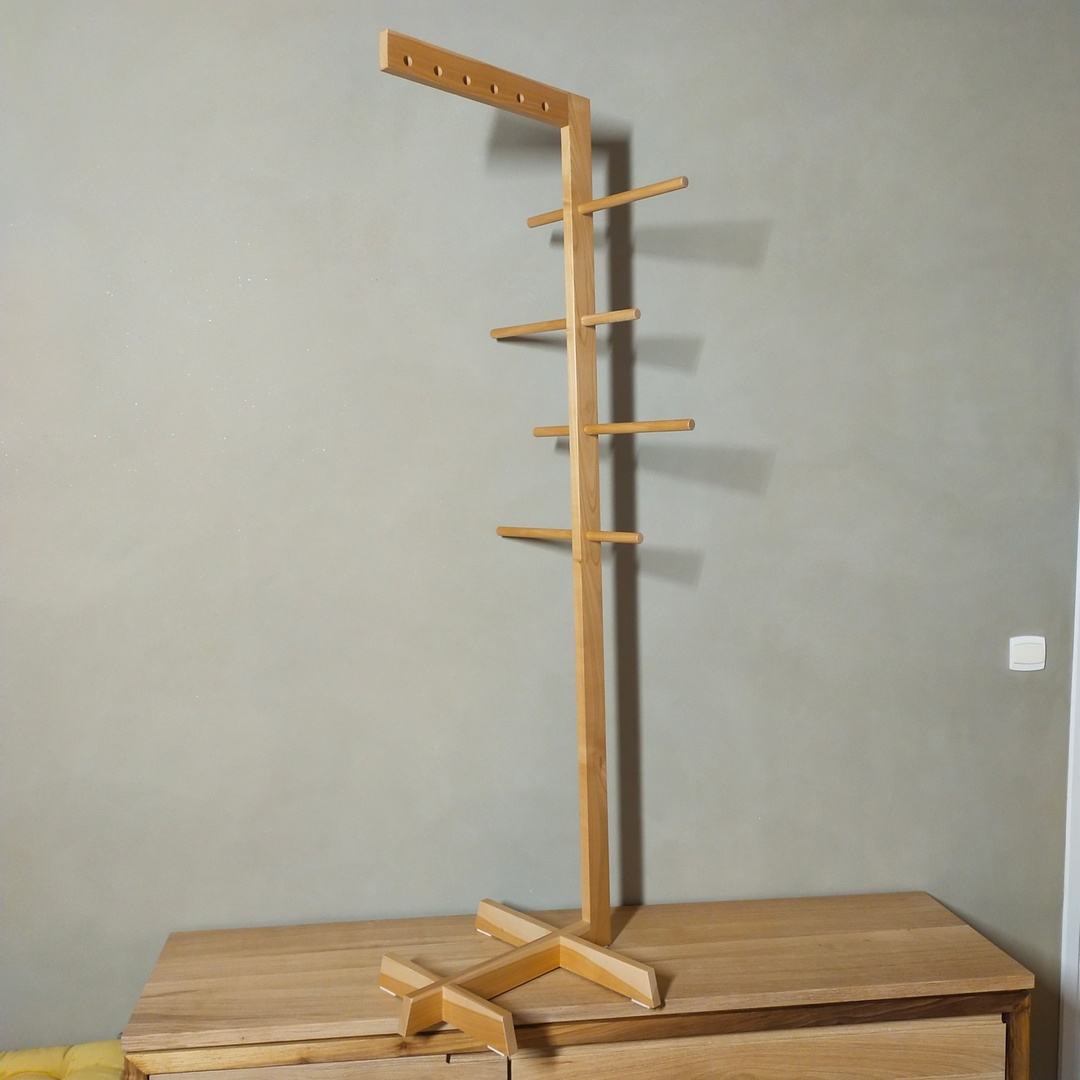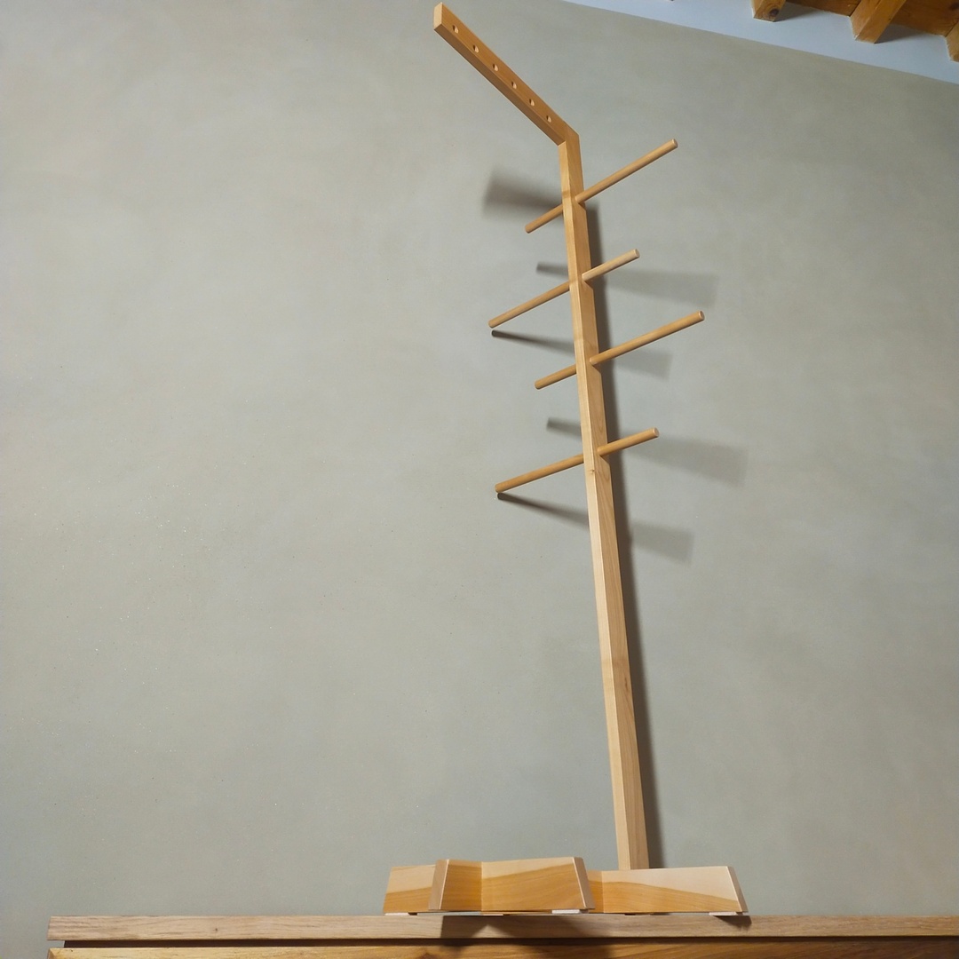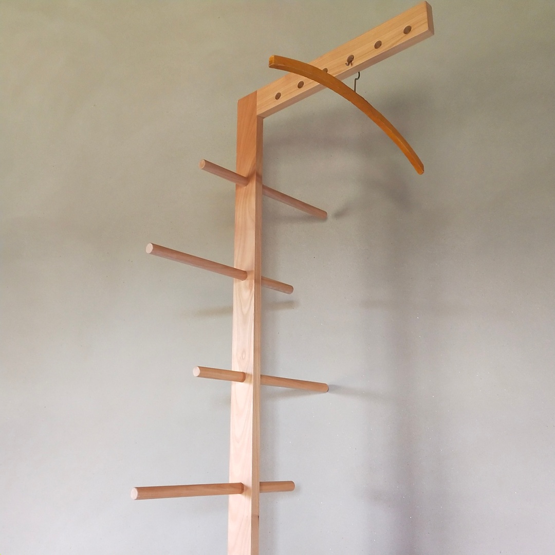 Ce valet de chambre est en merisier. Il comporte six supports de cintres et 8 barres de penderie. Il a reçu une finition huilée.